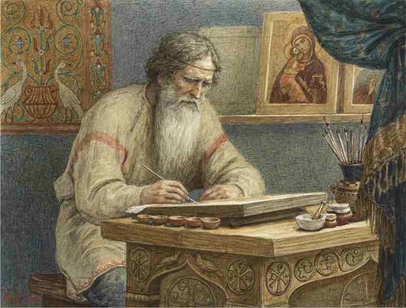 How is it different? First, the people who take on the difficult task of writing sacred history in colors treat the subjects of their creations in a very pious manner with fasting and prayer, always trying to stay within the Holy Traditions that have always guided their compositions. They do not invent anything new; they are just exposing the revealed glory of God. Their work serves a high purpose: it is a kind of ministry to the people who use their handiwork. But in order to achieve this goal, they must try to match their personal lives as closely as possible to those of their saintly subjects. Think of St. Lazarus the Iconographer of Constantinople, St. Andrei Rublev from Russia, St. Gregory the Iconographer of the Kiev Caves, and many other pious writers of icons from the past, and you will clearly understand what I mean.