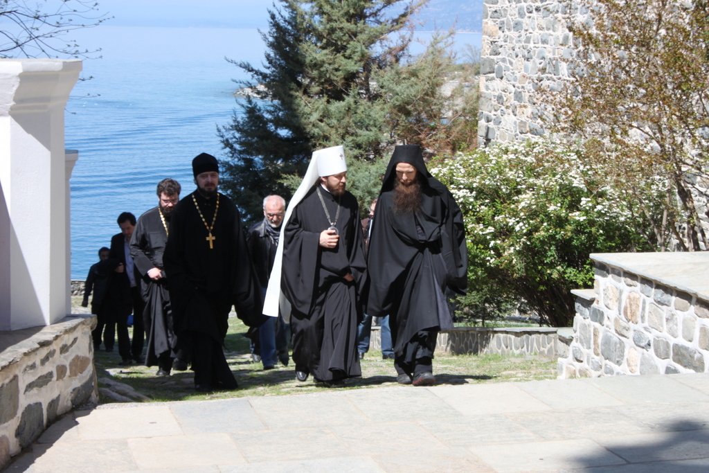 On 13 April 2013, Metropolitan Hilarion of Volokolamsk, chairman of the Moscow Patriarchate’s Department for External Church Relations (DECR) arrived in the Holy Mountain of Athos as head of a group of pilgrims, which consists of hegumen Philaret (Bulekov), DECR vice-chairman; archpriest Igor Yakimchuk, DECR secretary for inter-Orthodox relations; hieromonk Antoniy (Sevryuk), secretary of the Moscow Patriarchate’s parishes in Italy; hierodeacon Ioann (Kopeikin), assistant to the DECR chairman; and four laymen, including Anatoly Churiakov, a DECR staff member.