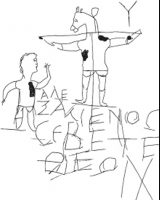 This is called the Palatine Graffito; it was scratched on a wall at the boarding school for imperial page boys, on the Palatine hill in Rome, about the year 200. It’s the earliest depiction of the Crucifixion ever found. The writing says, “Alexamenos worships his god,” and, as you see, the crucified Christ has a donkey head. A Christian boy was being ridiculed by his classmate. This is the earliest depiction of the Crucifixion, and it ridicules the Cross.