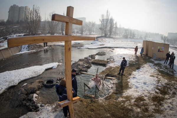 People take a dip in cross-shaped ice hole in Kiev, Ukraine(Gleb Garanich/Reuters)