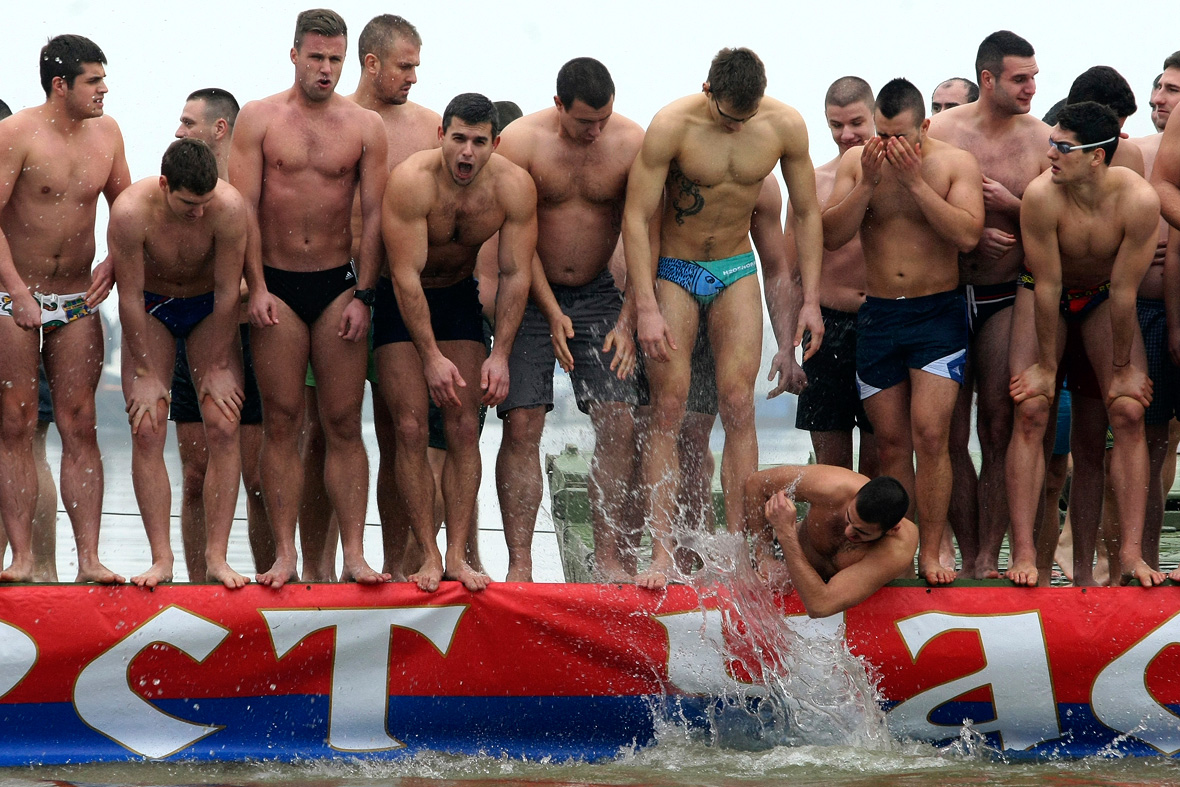 A man splashes cold water on other men before they swim for a wooden cross on Epiphany Day in Belgrade, Serbia. Orthodox priests throughout the region bless the waters by throwing a cross into it. It is believed that catching the cross brings health and prosperity(Djordje Kojadinovic/Reuters)